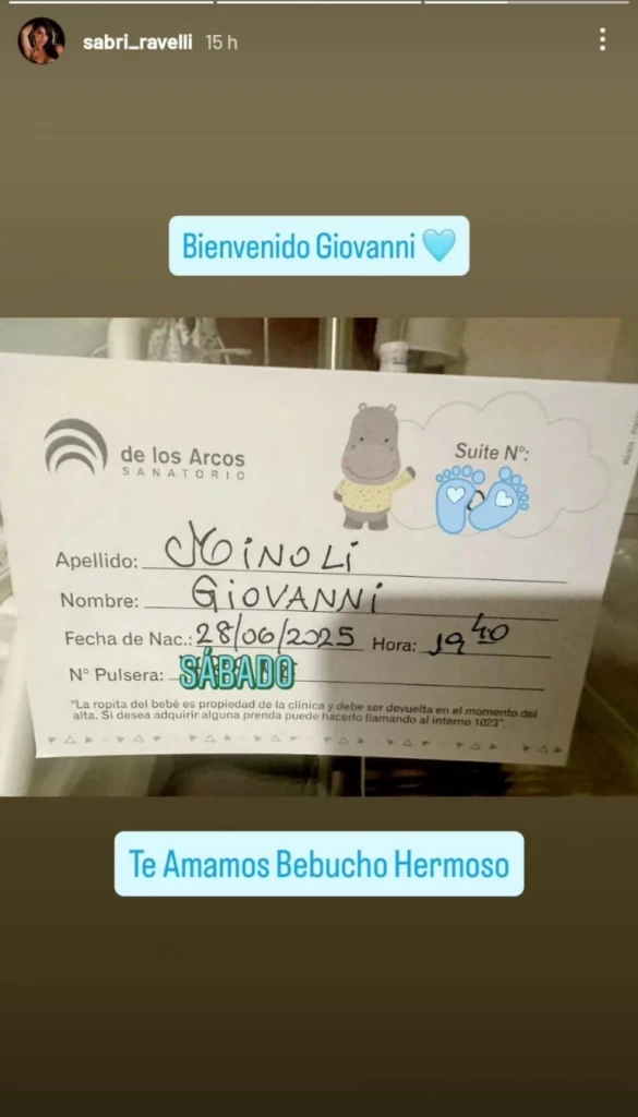 La actriz Sabrina Ravelli atraviesa uno de los momentos más felices de su vida. El pasado sábado 28 de junio, a las 19:40, nació Giovanni, su segundo hijo junto a su pareja, Maximiliano Minoli. Aunque el parto estaba previsto para el 3 de julio, el pequeño decidió adelantarse unos días y llegó al mundo en el Sanatorio de los Arcos.