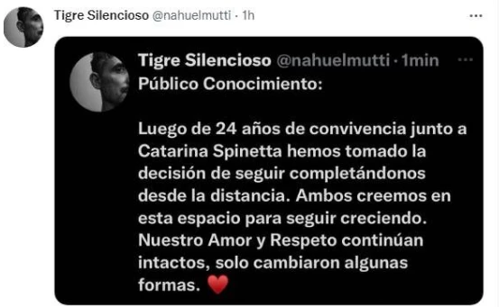 Mutti escribió unas líneas en la plataforma digital y expresó: "Luego de 24 años de convivencia con Catarina Spinetta hemos tomado la decisión de seguir completándonos desde la distancia. Ambos creemos en este espacio para seguir creciendo".