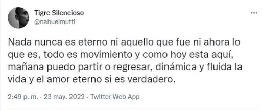 Empero, este lunes, Nahuel tomó impulso y saltó a su cuenta oficial de Twitter para armar un mensaje muy emotivo, con tintes poéticos, en el que se refirió a este cierre de la pareja, a esta determinación de elegir otros horizontes disímiles.