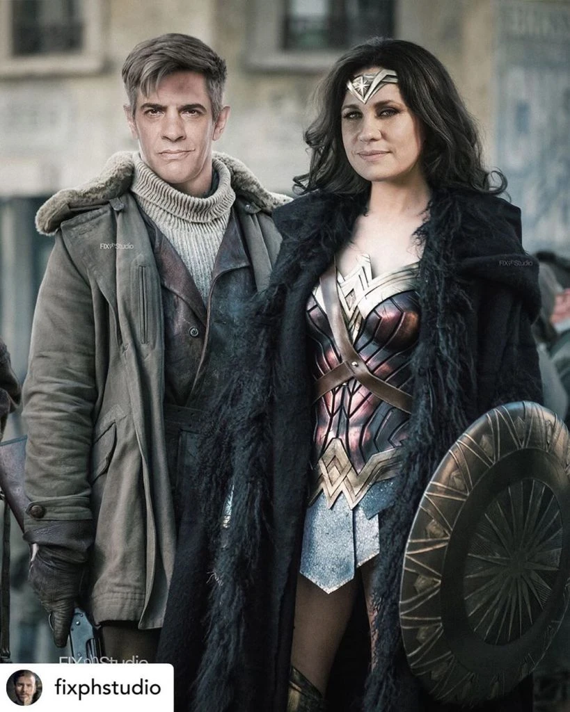 Con efecto de Photoshop y el arte de fixphstudio, Nancy se convirtió en la Mujer Maravilla y él como Steve Trevor de la misma película, ambos ídolos de la pareja de actores.