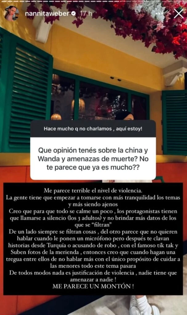 “De un lado siempre se filtran cosas, del otro parece que no quieren hablar cuando le ponen un micrófono pero después te clavan historias desde Turquía o acusando de robo, con el famoso tic tac y suben fotos de la merienda, entonces creo que cuando hagan una tregua entre ellos de no hablar más con el único propósito de cuidar a las menores todo este tema pasará. De todos modos, nada es justificación de violencia, nadie tiene que amenazar a nadie. Me parece un montón”, cerró Weber.