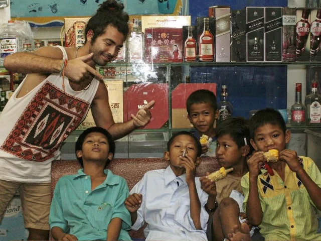 Casero se mostró junto a un grupo de niños que estaban comiendo a su lado. Incluso, a algunos de ellos se los ve fumando a pesar de su corta edad. También reprodujo parte del paisaje local posando en un lugar en donde las paredes estaban talladas con imágenes singulares.