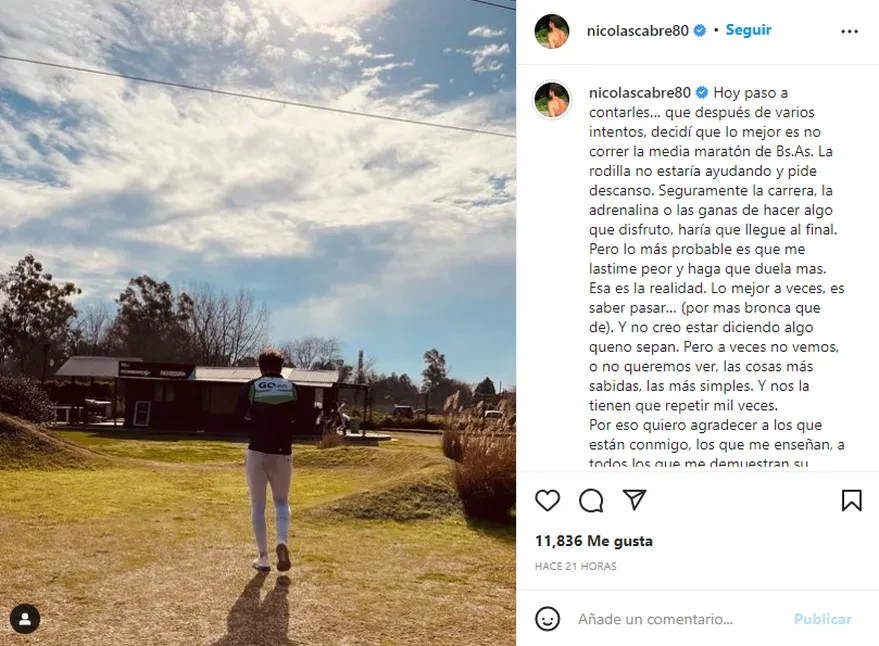 “Hoy paso a contarles que después de varios intentos, decidí que lo mejor es no correr la Media Maratón de Buenos Aires”, informó el actor a través de una posteo que publicó este sábado por la tarde, horas antes de que den la largada desde la Avenida Figueroa Alcorta. Y señaló: “La rodilla no estaría ayudando y pide descanso”.