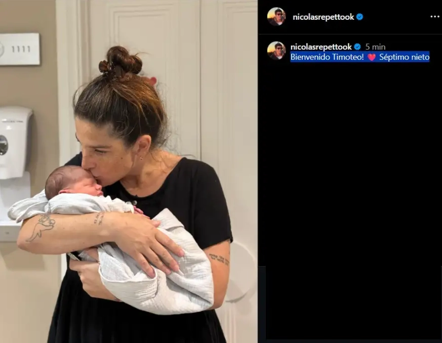 Sin embargo, esa privacidad y armonía digital se rompió desde otro lugar: el del abuelo orgulloso. ¿Qué pasó? Nicolás Repetto, papá de Juana, decidió compartir una postal que conmovió a todos. En la imagen se ve a la influencer con Timoteo en brazos, dándole un beso en la frente y en una escena llena de amor. El conductor sumó una frase emotiva: “Bienvenido Timoteo! ️ Séptimo nieto”.