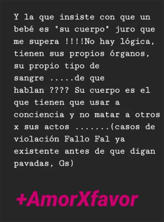 Además, en las historias de su cuenta de Instagram la top model compartió una pregunta que Feimann hizo: "No logro que ningún diputado pro aborto me responda esto: si no es un bebé lo que hay dentro de la panza, ¿por qué se pagan asignaciones por hijo durante el embarazo?".