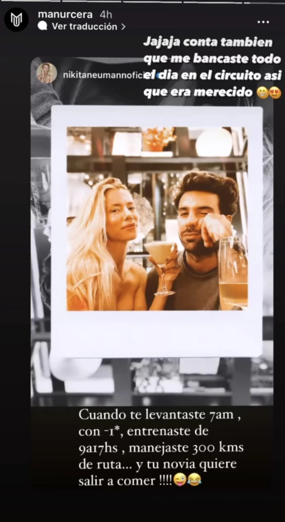 Con una foto en la que ella luce radiante y el piloto con un rostro demacrado por el cansancio, Nikita escribió: “Cuando te levantaste 7 am con -1° centígrado, entrenaste de 9 a 17, manejaste 300 kilómetros de ruta...y tu novia quiere salir a comer”.
