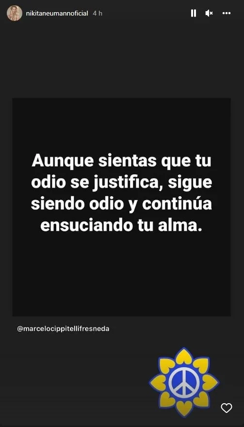 Ahora bien, resulta que fue Nicole Neumann quien decidió salir al cruce y si bien no etiquetó a Mica Viciconte el mensaje parece ir directo para la madre de Luca: “Aunque sientas que tu odio se justifica, sigue siendo odio y continúa ensuciando tu alma”.