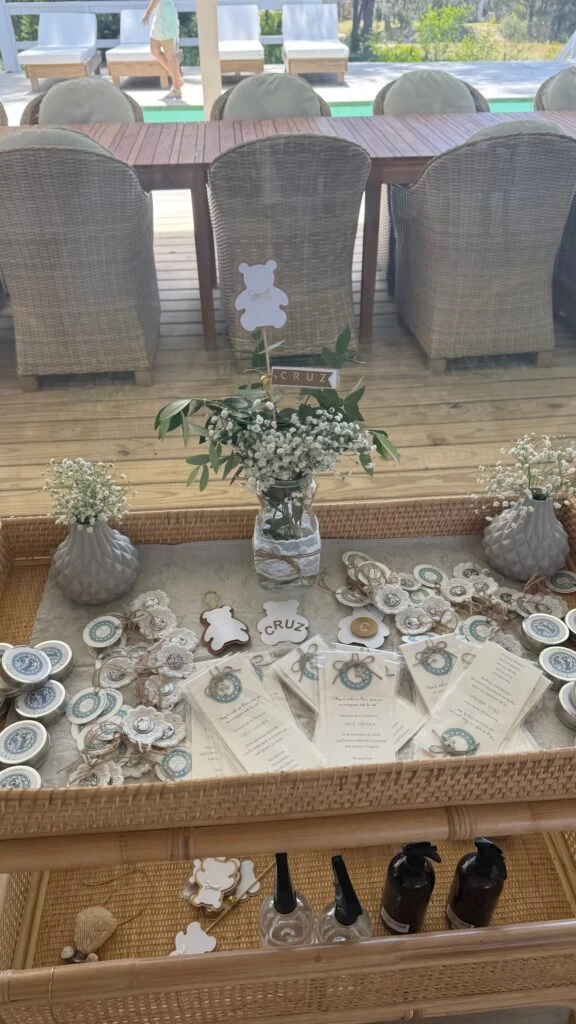 Nicole estuvo compartiendo cada uno de los detalles en sus redes sociales. Por un lado mostró la dulce ambientación elegida para este momento, con colores muy cálidos, tonalidades armoniosas donde predominaron los blancos y celestes. Por esta misma línea estaba la torta de dos pisos, una de las grandes protagonistas de la tarde, con una cruz dorada en el centro y también un osito -algo no casual, ya que la modelo suele utilizar un emoji de este animal para cubrir el rostro de Cruz cuando sube fotos a sus redes-.