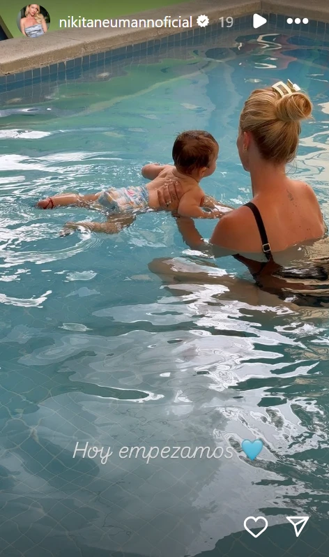 “Hoy arrancamos”, anunció la blonda en sus historias de Instagram, donde se mostró dentro de la piscina con su bebé Cruz Urcera, muy pancho haciendo la plancha, feliz ante el plan de flotar en el medio acuático con su mamá.