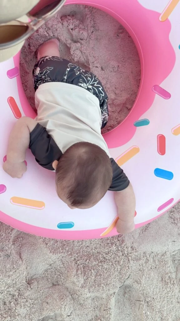 Nicole publicó un par de imágenes con el bebé a upa, de perfil y subió un clip en el que registró los primeros pasitos de su hijo menor en la arena durante estas divertidas vacaciones que decidió tomarse para descansar durante la previa a su cumpleaños.