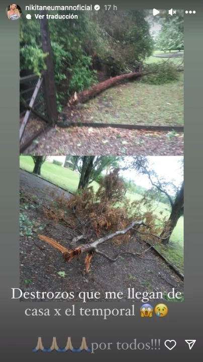 Le llegaron fotos donde vio las consecuencias que generó en los alrededores de su hogar, en la zona de Tigre, la abundante agua que cayó y que se combinó con ráfagas de hasta 150 kilómetros por hora. “Destrozos que me llegan de casa por el temporal. Rezo por todos”, expresó Nicole, junto a las postales de árboles derrumbados por lo sucedido.