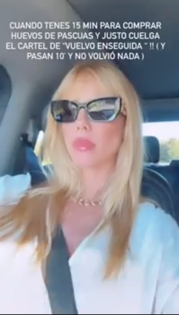 A través de su cuenta de Instagram, compartió un video donde manifestó su enojo por no haber encontrado lo que necesitaba. En el clip, se la puede ver conduciendo y diciendo sin sonido la expresión "la con... de la lora". Junto al video, escribió: "Cuando tenes 15 minutos para comprar huevos de Pascua y justo cuelga el cartel de 'Vuelvo enseguida' (pasan 10 minutos y no vuelve nada)".