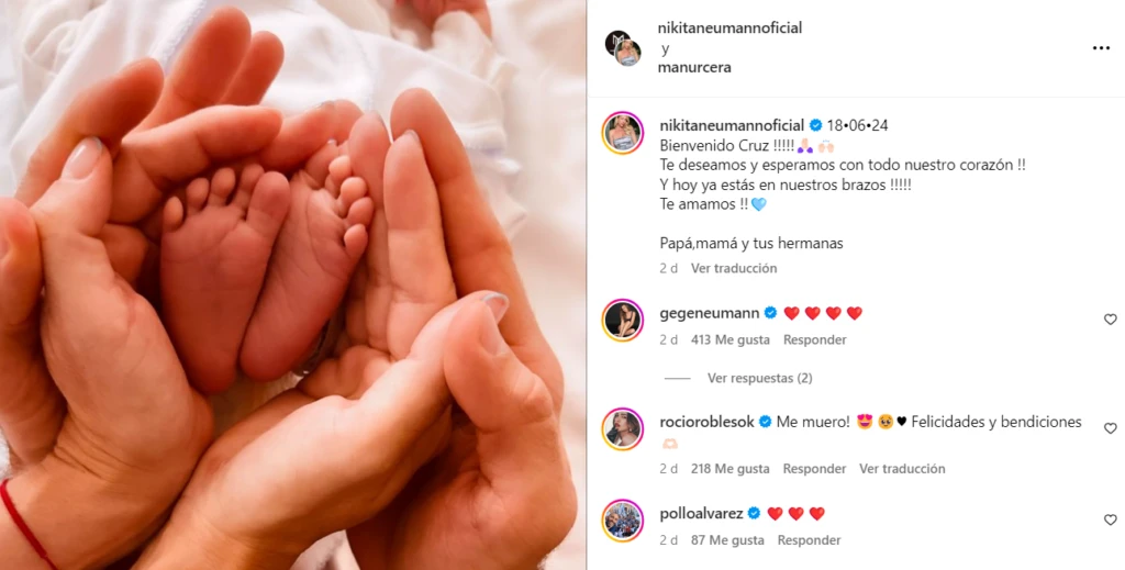 "¡Bienvenido Cruz!!! Te deseamos y esperamos con todo nuestro corazón. Y hoy ya estás en nuestros brazos!!! Te amamos, papá, mamá y tus hermanas". Este mensaje estuvo acompañado por una hermosa foto donde se ven las manos de Urcera, las manos de Nicole y los pies del pequeño Cruz.