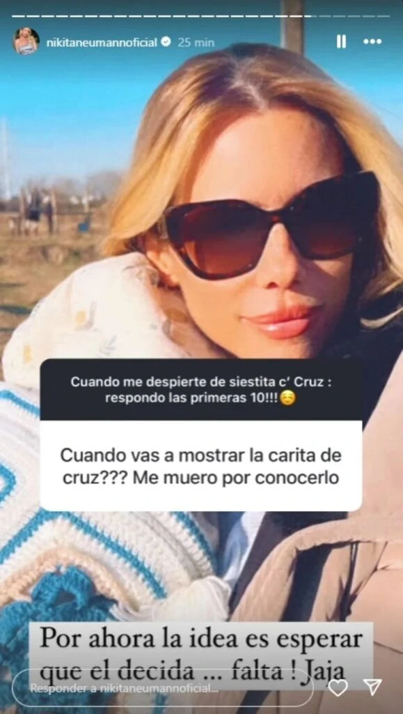 “¿Cuándo vas a mostrar la carita de Cruz? Me muero por conocerlo”, le escribió uno de sus miles seguidores. A lo que Nikita, usando como fondo de la historia una foto con Cruz en brazos y con la cabecita cubierta con una mantita justificó su postura.
