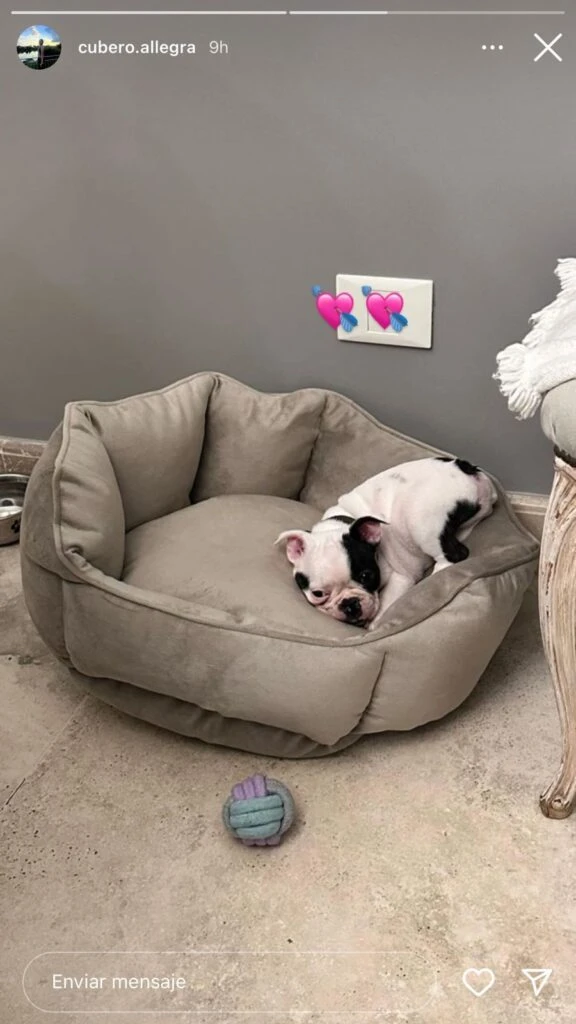 La raza de la nueva mascota que tienen Nicole, Allegra, Sienna y Manu Urcera, es un bulldog francés al que ya le están demostrando mucho amor. En las fotos se puede ver a la mascota durmiendo en una cucha muy cómodamente y hasta en la cama del matrimonio.