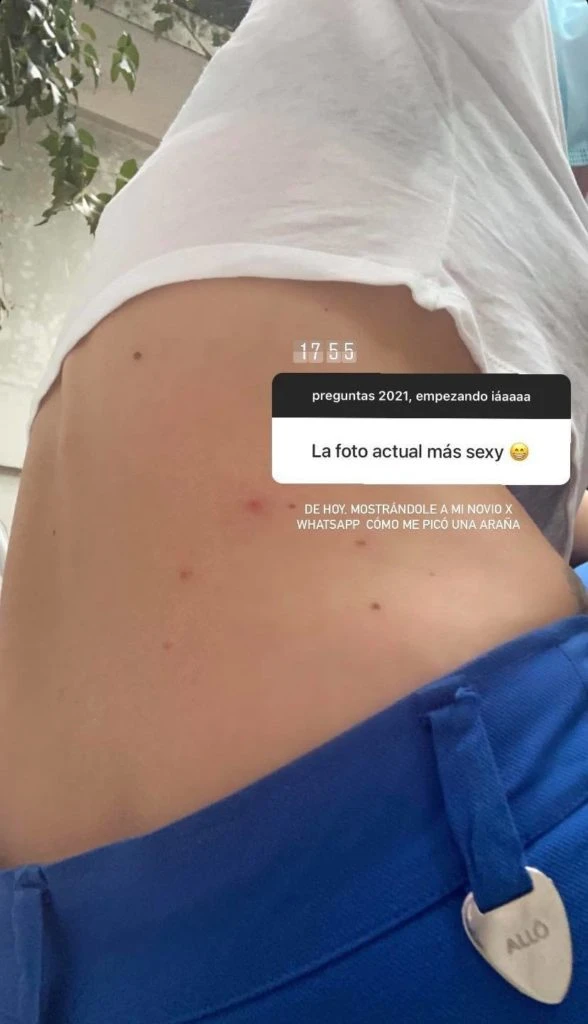 A su modo, y lejos de esquivar la pregunta donde le pedían por la foto actual más sexy, Cid compartió en la historia una imagen donde se la ve con pantalón azul tiro bajo, pupera blanca, mostrando la panza y cintura. La misma fue explicada por la actriz quien escribió, “es de hoy, mostrándole a mi novio por whatsapp como me picó una araña”.