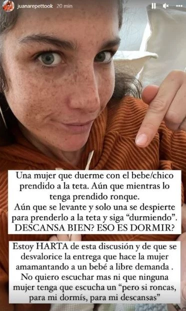 "Estoy harta de esta discusión y de que se desvalorice la entrega que hace la mujer amamantando a un bebé a libre demanda. No quiero escuchar más ni que ninguna mujer tenga que escuchar un 'pero si roncás para mí dormís, descansás'", siguió.