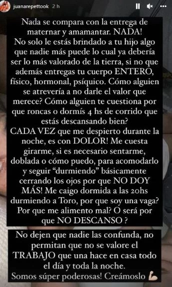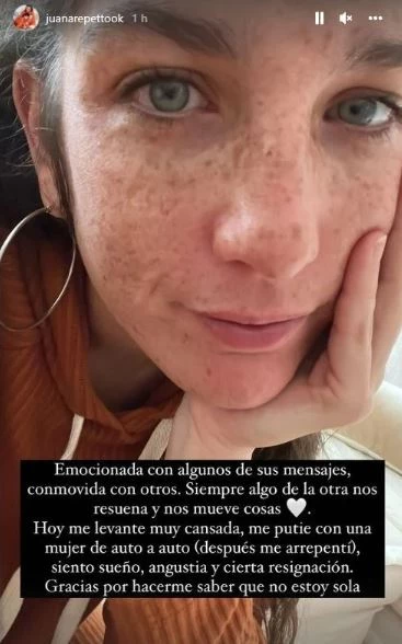 Luego de este descargo, Juanita agradeció. "Emocionada con algunos de sus mensajes, conmovida con otros. Hoy me levanté muy cansada, siento sueño, angustia y cierta resignación. Gracias por hacerme saber que no estoy sola", escribió. Y cerró: “No se olviden, estoy puérpera".