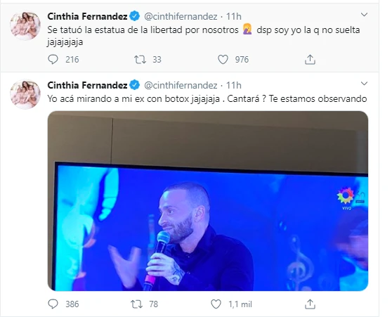 Sin embargo desde el Twitter, Cinthia Fernández se burló de Baclini y su bótox: "Yo acá mirando a mi ex con botox jajajaja . ¿Cantará? Te estamos observando", fue el mensaje que escribió durante la gala.