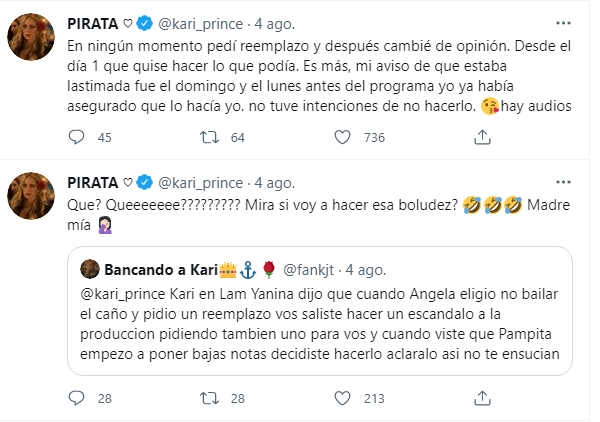 Karina desmintió a través de Twitter lo dicho por Yanina. El posteo indicaba: "Kari en Lam Yanina dijo que cuando Angela eligió no bailar el caño y pidió un reemplazo vos saliste hacer un escandalo a la producción pidiendo también uno para vos y cuando viste que Pampita empezó a poner bajas notas decidiste hacerlo. Aclaralo así no te ensucian", solicitó uno de sus seguidores.