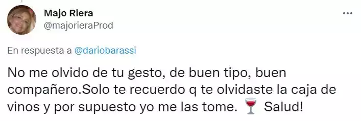 Finalmente, Riera cerró el ida y vuelta con más halagos para el humorista y el mismo tono risueño: “No me olvido de tu gesto, de buen tipo, buen compañero. Sólo te recuerdo que te olvidaste la caja de vinos y, por supuesto, yo me las tomé”.
