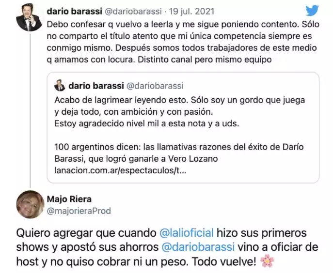 Emocionado por una nota de La Nación, llena de piropos por su conducción del programa de El Trece, Barassi agradeció en Twitter a quienes hicieron la nota y a sus seguidores, que lo bancan en todos sus proyectos. Y entre las respuestas a su tweet, se coló el de la mamá de Lali, que levantó la mano para recordar un asunto del pasado.