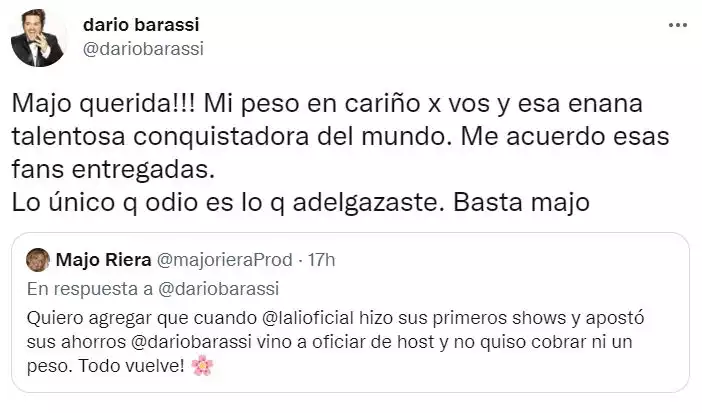 ¿Y qué dijo Majo Riera? “Quiero agregar que cuando Lali hizo sus primeros shows y apostó sus ahorros, Darío Barassi vino a oficiar de host y no quiso cobrar ni un peso. ¡Todo vuelve!”, destacó la mamá de Espósito en su cariñoso mensaje que llamó la atención de Darío, que se apuró en responderle.