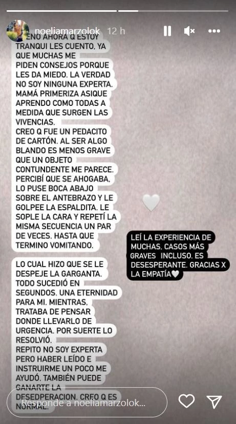 Ya más serena y pasado el mal momento, Marzol contó lo que había pasado: “Ahora que estoy más tranqui les cuento ya que muchas me piden consejos porque les da miedo. La verdad, no soy ninguna experta, mamá primeriza, así que aprendo como todas a medida de que surgen las vivencias”.