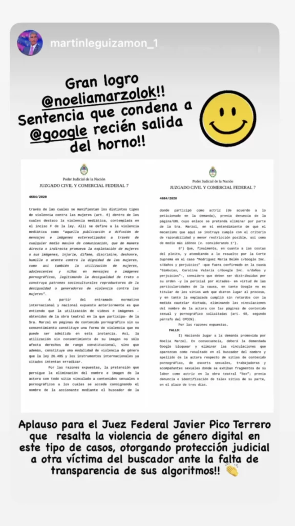En la historia de Marzol publicó un documento oficial, en donde se vio que ganó el juicio y elogió al juez que llevó su causa. Ella escribió en la descripción: "Aplauso para el Juez Federal Javier Pico Terrero que resalta la violencia de género digital en este tipo de casos, otorgando protección judicial a otra víctima del buscador ante la falta de transparencia en sus algoritmos".