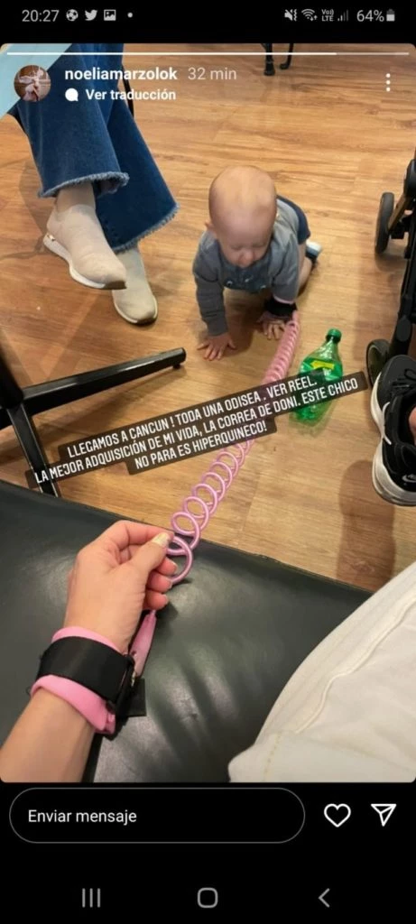 "Llegamos a Cancún. Toda una odisea. La mejor adquisición de mi vida. La correa de Doni. Este chico no para, ¡es hiperquinético!", escribió la actriz, al tiempo en que mostraba cómo mantenía controlado a su bebé con una especie de correa espiral con la que lograba evitar que se aleje.