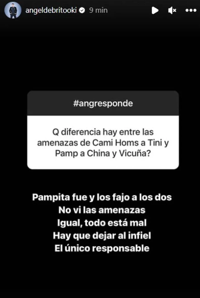 Sin embargo, fue el propio de Brito quien diferenció a Camila de Carolina Ardohain, no por lo sucedido, sino por la reacción que tuvo cada una ante la crisis de pareja. “¿Qué diferencia hay entre las amenazas de Homs a Tini y Pampita a la China y Vicuña?”, consultó un seguidor a través de la caja de preguntas y respuestas.