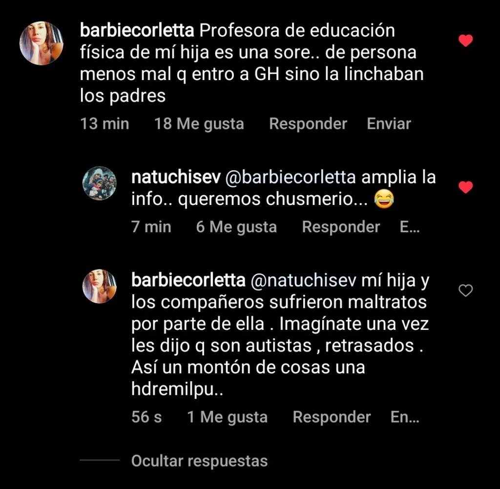 “Si no la sacan a esta mina del programa, vamos a hacer un reclamo con todos los niños del Instituto Santa Ana. Esta mina ha maltratado a muchos chicos, con insultos y castigos”; “Menos mal que entró a GH, sino la linchaban los padres. Mi hija y sus compañeros sufrieron maltratos de parte de ella”, escribieron.