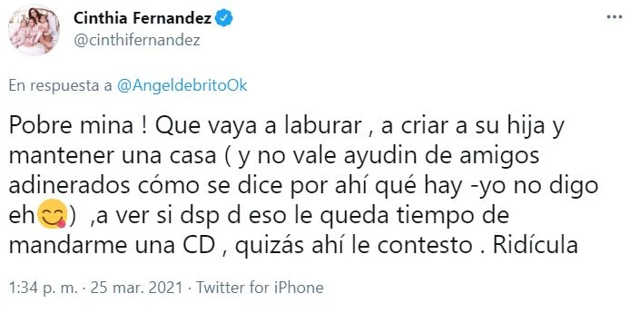 "¡Pobre mina! Que vaya a laburar, a criar a su hija y a mantener una casa (y no vale el 'ayudin' de amigos adinerados como se dice por ahí qué hay, yo no lo digo, eh). A ver si después de eso le queda tiempo de mandarme una carta documento. Quizás ahí le contesto. Ridícula", lanzó.