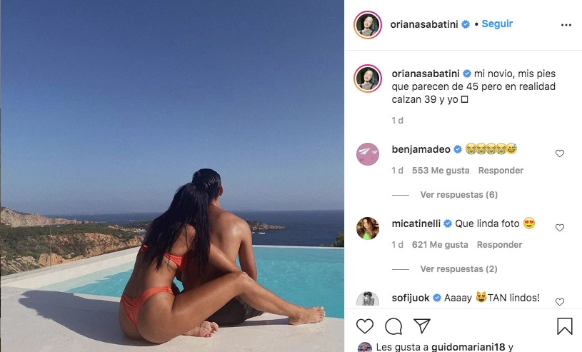 Paulo eligió una instantánea de ambos al borde de la pileta, en la que la joven Sabatini lo abraza desde atrás y le adjunto como descripción: “Con amor”. Mientras que la hija de Cathy Fulop posteó una similar, en la que los dos le dan la espalda a la cámara y se destaca el fondo y le escribió una frase graciosa: “Mi novio, mis pies que parecen de 45 pero en realidad calzan 39 y yo”.
