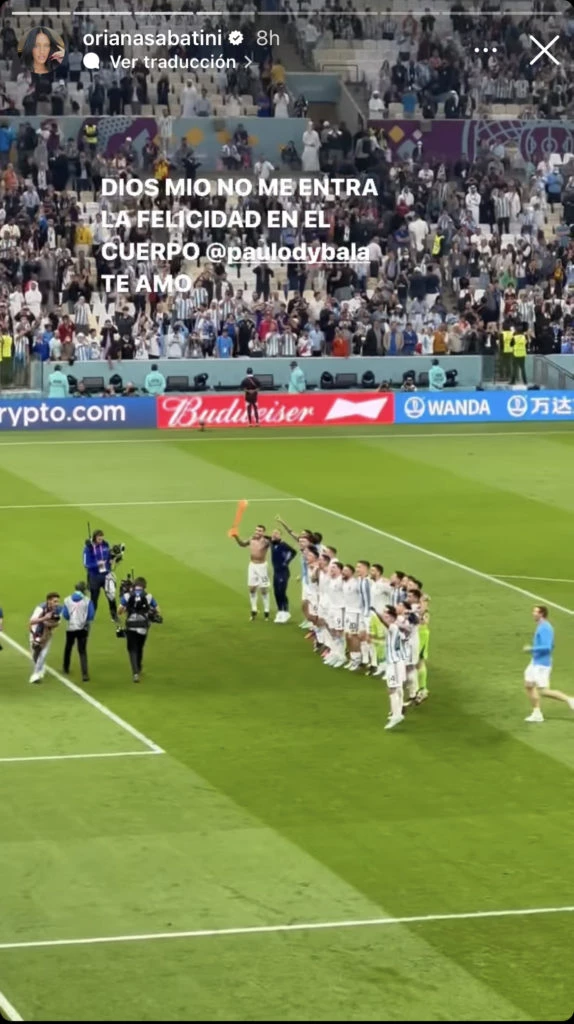 Mediante su cuenta de Instagram, Oriana compartió una foto de la Selección y escribió: “Dios mio, no me entra la felicidad en el cuerpo. Paulo Dybala te amo”. El cordobés compartió el posteo en sus redes sociales, pero no escribió nada al respecto sobre el mensaje de su novia.