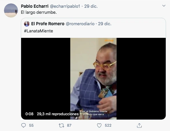 Con esa noticia en la mano, Echarri se tomó revancha de Lanata en sus redes sociales. En realidad, retuiteó un tuit del "Profe Romero" que destacaba lo que había sido su pronóstico y simplemente escribió un comentario: "El largo derrumbe" puso.