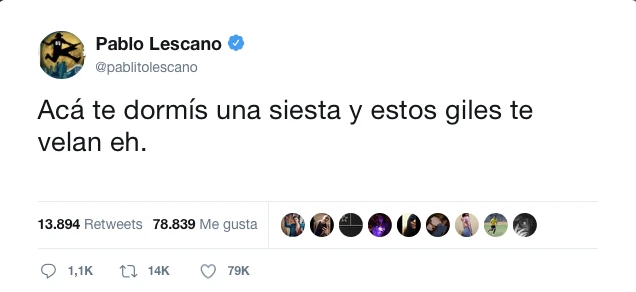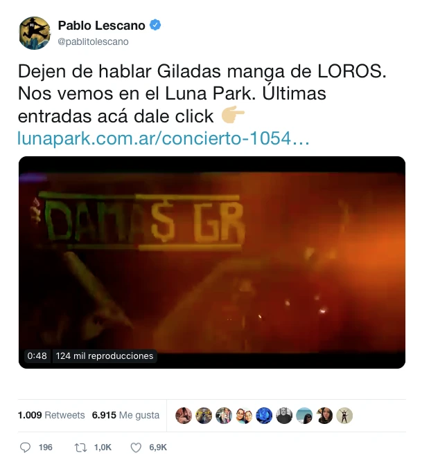 Pero lo que menos se esperaba era que Pablo Lescano saliera tan rápido a dar explicaciones, y se descargó a través de las redes sociales Twitter e Instagram. Con un video publicitario en donde promueve la venta de entradas para sus próximos shows en el Luna Park, el cantante escribió: “Dejen de hablar giladas manga de LOROS. Nos vemos en el Luna Park. Últimas entradas”.