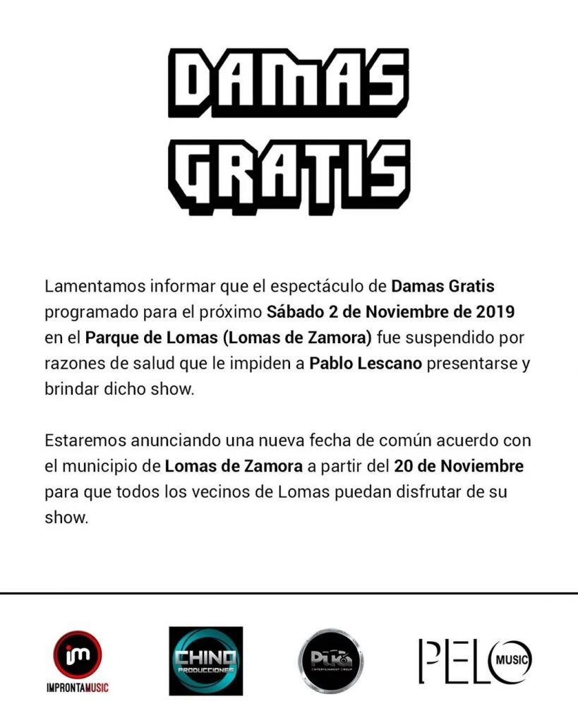 “Lamentamos informar que el espectáculo de Damas Gratis fue suspendido por razones de salud que le impiden a Pablo Lescano presentarse y brindar el show”, dice un fragmento del comunicado que la productora de espectáculo Impronta Music publicó en su cuenta oficial de Instagram.