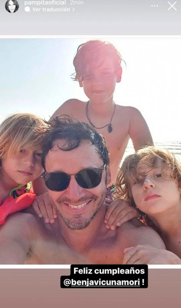 Sí, aunque suene muy sorpresivo e incluso impensado, Pampita armó un posteo en su plataforma para dedicarle unas lindas líneas a su ex: “Feliz cumpleaños Benjamín”. Esa storie se acompaña por una foto del actor con sus tres herederos.