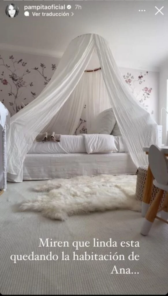 Además en las imágenes se vieron otros detalles que indican los cambios en la habitación para una nueva etapa como un jueguito de mesa y sillas con respaldar de conejitos, una mecedora con forma de oveja, una alfombra de piel sintética y una carpa para que la pequeña pueda disfrutar al máximo los juegos en su habitación. Lo que la modelo decidió conservar fue el empapelado blanco con flores en tonos lilas.