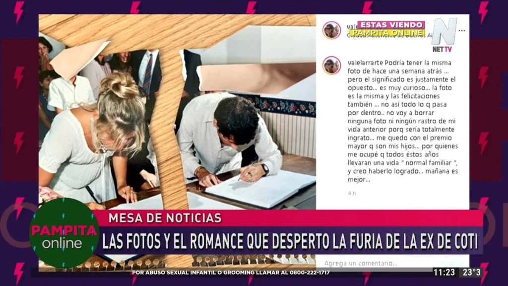Uno de los temas más candentes de la semana ha sido la confirmación de la relación entre Coti Sorokin y Candelaria Tinelli. Luego de que se confirmara el romance, la voz más buscada fue la de Valeria Larrarte y en más de una ocasión dijo no estar molesta. Sin embargo al pasar los días, la ex de Coti ha ido expresando sus sentimientos en sus redes sociales y sobre esto opinaron en Pampita Online.