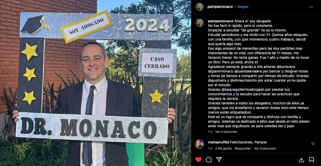"Abandoné la carrera 1 año y medio porque obviamente no tenía ganas de estudiar. Estuve sin tocar 1 libro aunque solo me quedaban rendir 23 finales. A mitad del año pasado me puse las pilas y rendí el primer final que me quedaba a fines del año pasado", compartió Mónaco con Revista Paparazzi.