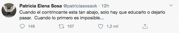 “Cuando el contrincante está tan abajo, solo hay que educarlo o dejarlo pasar. Como lo primero es imposible…”, expresó Patricia, en sus redes.