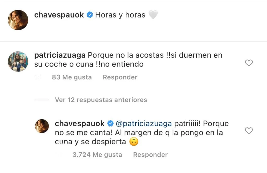 Pero sin dejarla pasar, Paula decidió responderle y escribió duramente: “Patri, ¡porque no se me canta! Al margen de que si la pongo en la cuna se despierta...”