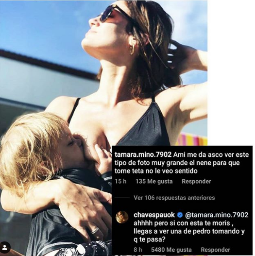 Desafortunadamente, una usuaria no tuvo mejor idea que comentar: “A mí me da asco ver este tipo de foto, muy grande el nene para que tome teta no le veo sentido". Como si fuese correcto opinar sobre la vida de los demás, tal vez escudándose en el anonimato de las redes.