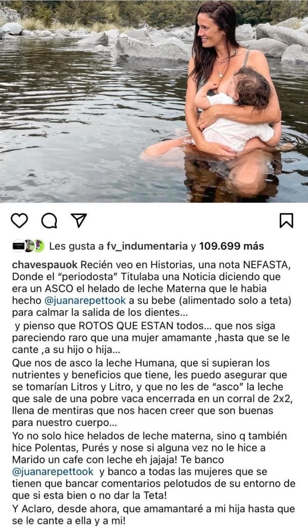 Finalmente, Paula cerró: “Te banco @juanarepettook y banco a todas las mujeres que se tienen que bancar comentarios pelotudos de su entorno de que si esta bien o no dar la Teta. Aclaro, desde ahora, que amamantaré a mi hija hasta que se le cante a ella y a mi".