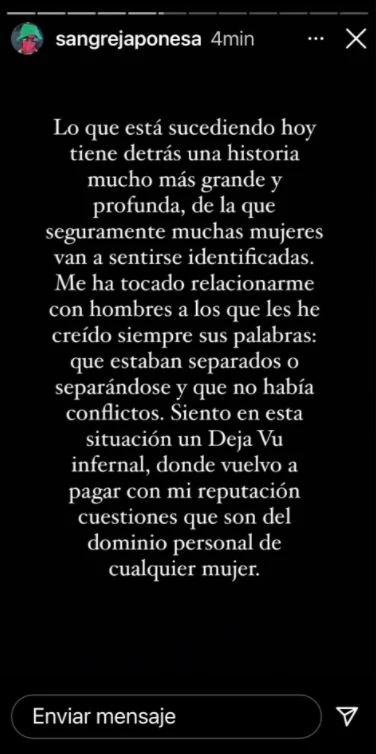 “Una repetición que deja a la luz mi inexperiencia y, sobre todo, profunda credibilidad que le di a estos hombres, que luego guardaron silencio dejando que me comieran los lobos. Parece que es más creíble para esta sociedad, sabiendo cómo se manejan ellos siempre, que yo sea la mala, la que engaña y no la engañada”.