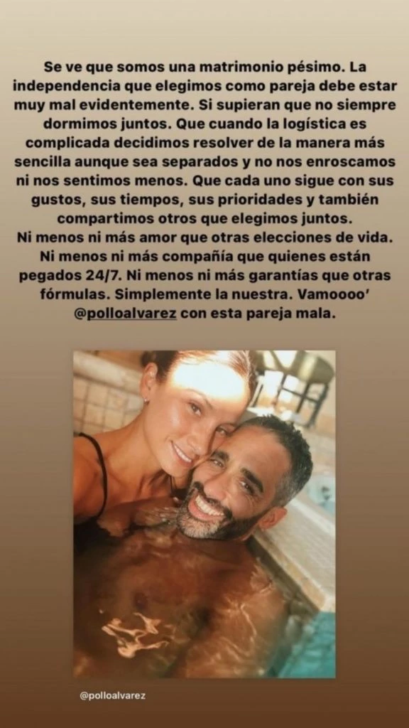En esa misma línea agregó: "Que cada uno sigue con sus gustos, sus tiempos, sus prioridades y también compartimos otros que elegimos juntos. Ni menos ni más amor que otras elecciones de vida. Ni menos ni más compañía que quienes están pegados 24/7. Ni menos. Vamooo Pollo Álvarez con esta pareja mala".