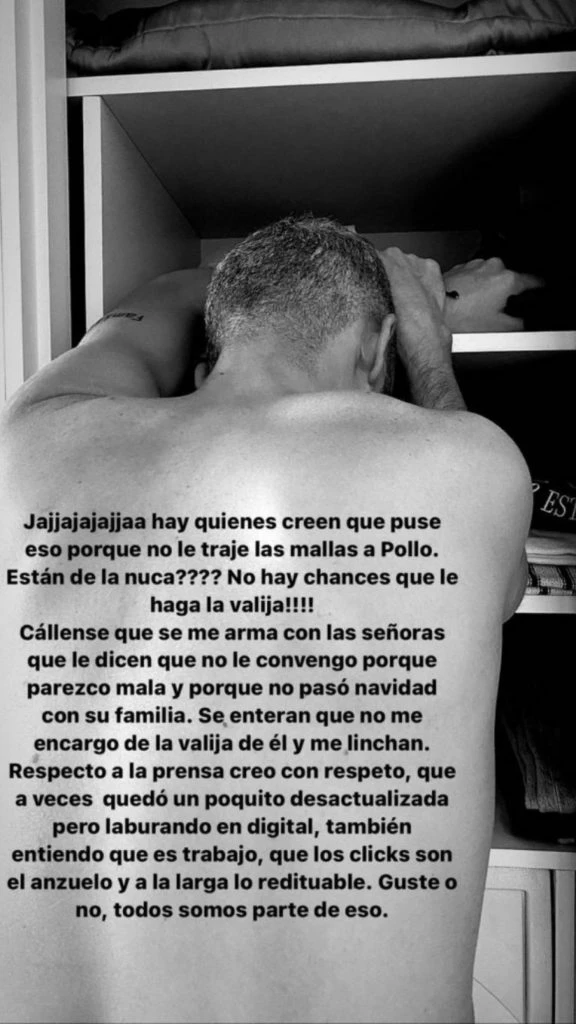Luego de su fuerte queja, Tefi Russo compartió una foto del Pollo indignado porque se había olvidado sus mallas en plenas vacaciones y al parecer, la gente relacionó todo, por lo que la cocinera tuvo que salir a aclarar las cosas una vez más: "Hay quienes creen que puse eso porque no le traje las mallas a Pollo. ¿Están de la nuca? Cállense que se me arma con las señoras que le dicen que no le convengo porque parezco mala y porque no paso Navidad con su familia".