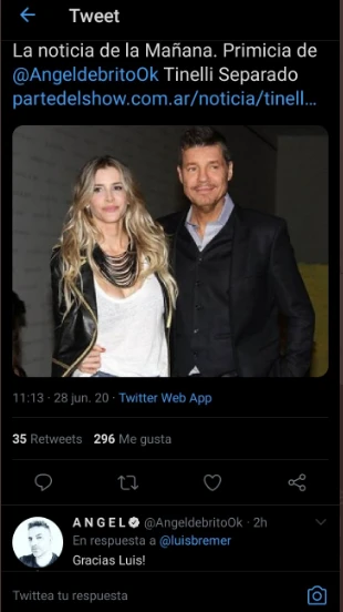 Como si fuese poco, cientos de usuarios empezaron a jugar sus cartas, algunos con capturas de pantalla para intentar avalar a Rial o de Brito como el primero que informó sobre la ruptura de Tinelli. Mucho fuego cruzado, así que esta separación también salpicó chispazos entre los periodistas.